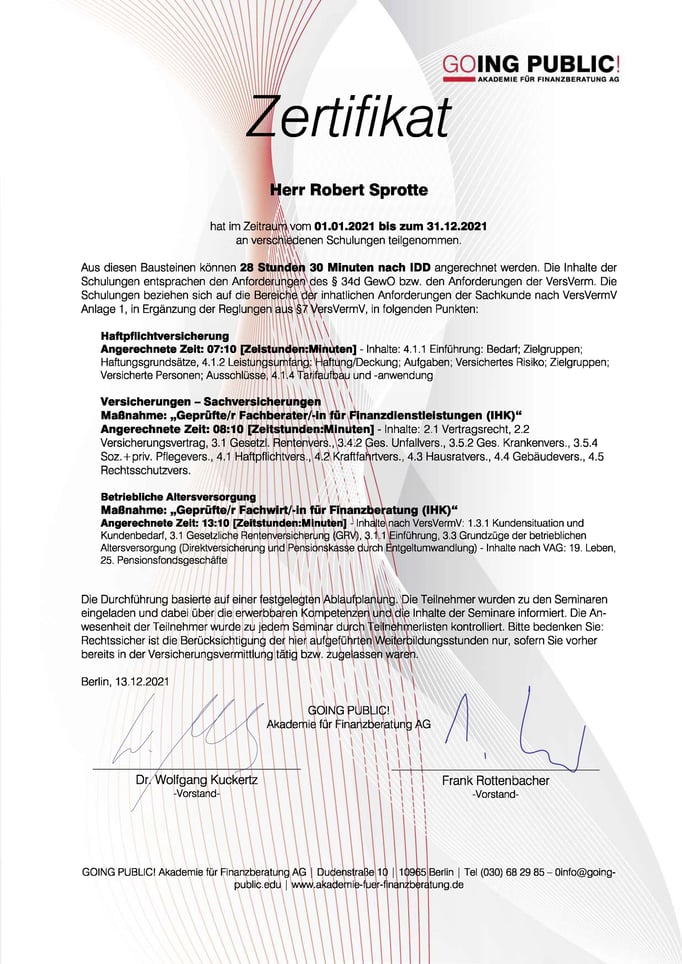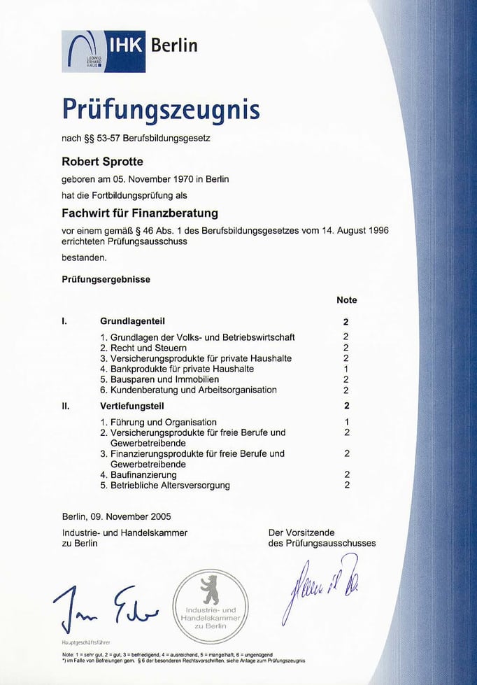 Im Laufe der Jahre habe ich vom Fachwirt für Finanzberatung (IHK) bis zum Master of Financial Sales Management berufsbegleitend eine Reihe von Qualifikationen erworben.